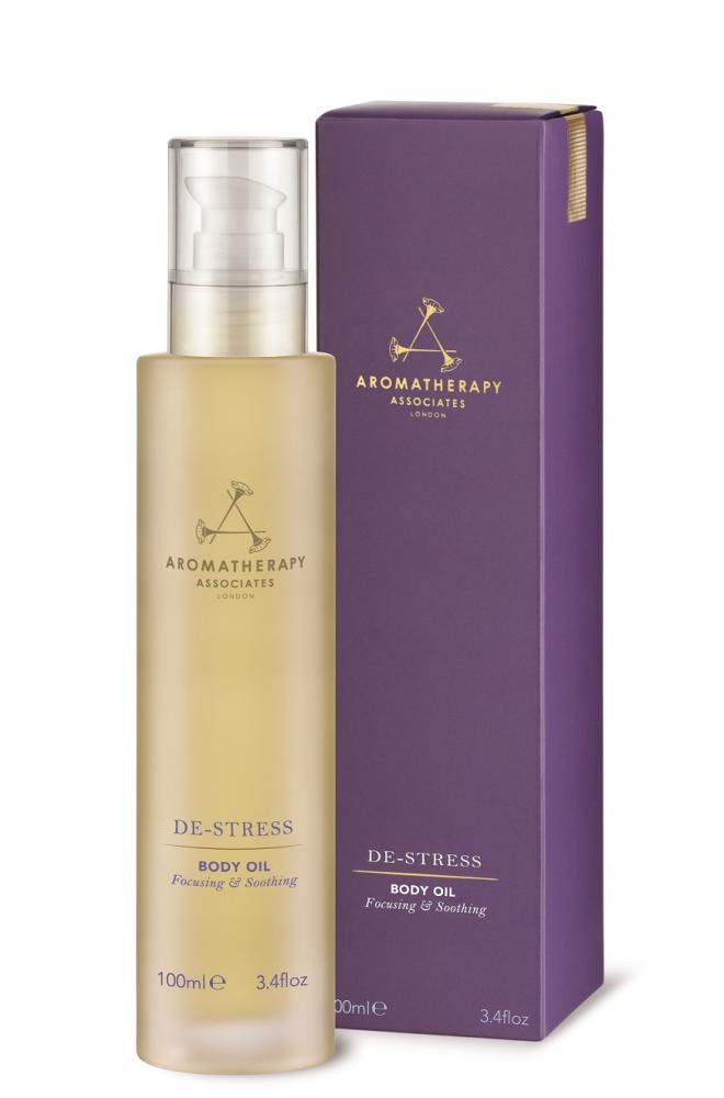 De-Stress Body Oil van Aromatherapy Associates heeft verkwikkende essentiële oliën die pijnlijke spieren en stramme gewrichten verlichten. Ook verzorgt de olie de huid.